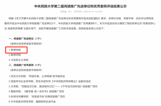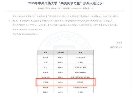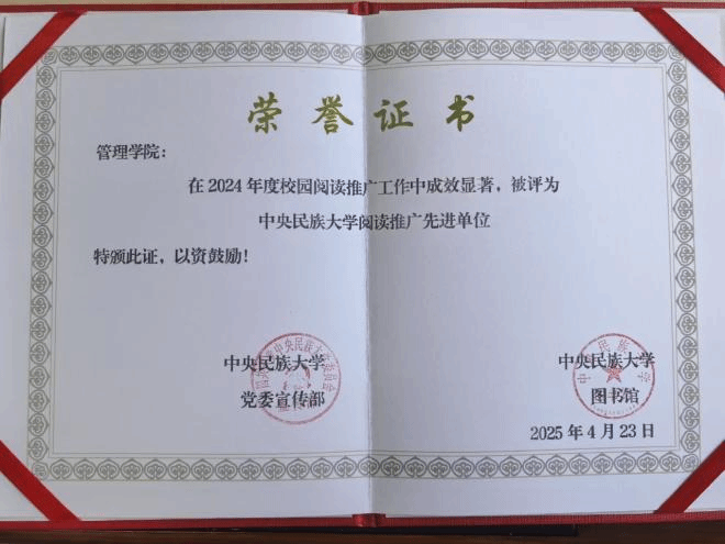 近日,“经典阅读—中央民族大学第二届阅读推广先进单位和优秀案例评选”活动和2025年中央民族大学“共美阅读之星”评选活动结果揭晓,五星体育F1直播