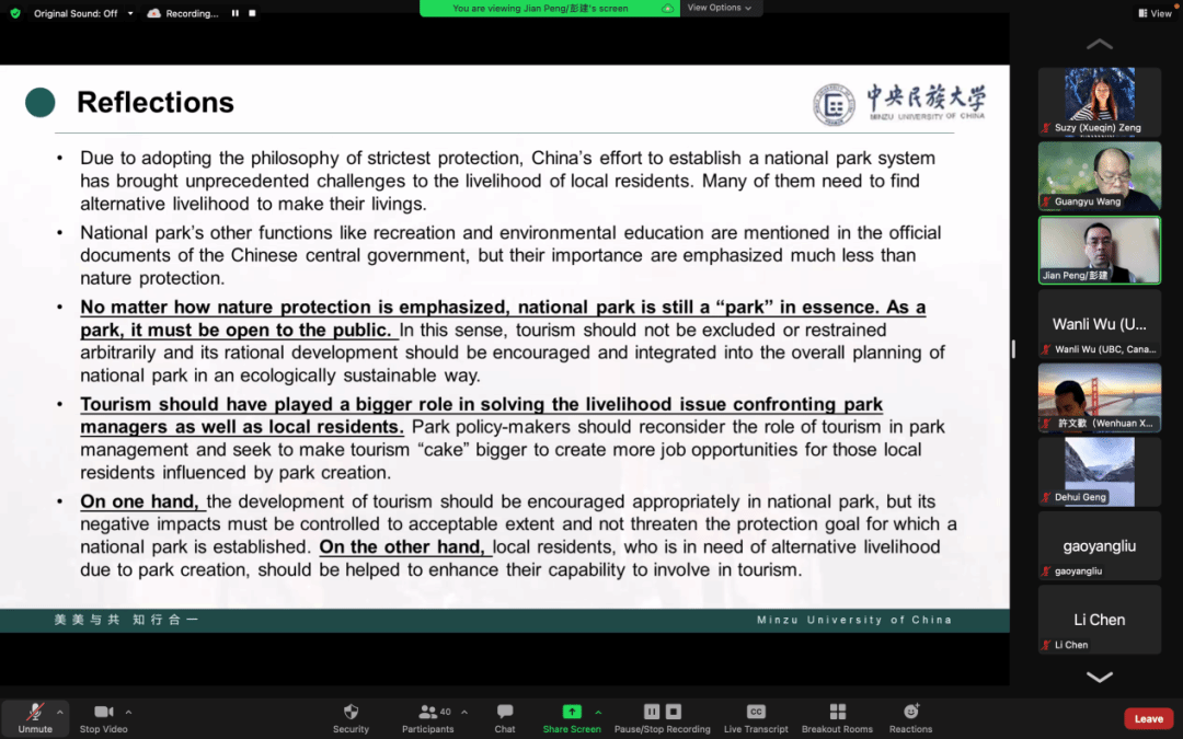 彭建教授围绕国家公园旅游替代生计的制约因素问题从四个方面进行了讲解。他首先介绍了中国自然保护地体系的概况、中国国家公园体制建设的历程和重大节点事件,结合精美的图片介绍了三江源等十个国家公园试点区的特征;其次简要介绍了我国十个国家公园试点区旅游业发展的情况,尤其是当前我国国家公园试点区旅游发展的个体差异;然后分析了发展旅游业在解决国家公园社区居民替代生计中的积极作用,最后结合他在祁连山和神农架国家公园试点区的考察和实地调研数据,从自然因素、经济因素、政策因素以及居民自身因素等四个方面阐述了制约中国国家公园社区居民旅游替代生计的主要因素,并针对这些因素和问题提出了自己的观点和建议。听完彭建教授的报告后,国际同行们就自己感兴趣的问题,与彭建教授进行了深入的讨论和交流,活动取得了圆满的成功。