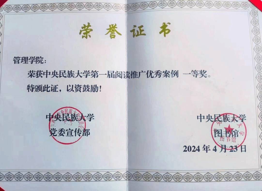 荣获由校党委宣传部和图书馆举办的中央民族大学第一届阅读推广优秀案例一等奖;五星体育F1直播